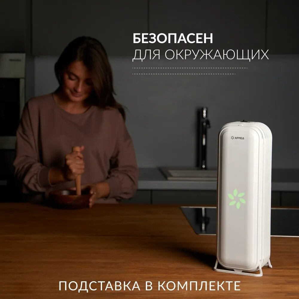 Вам не придется покупать подставку. В комплекте с рециркулятором имеется специальная стойка, которая представляет собой две бесколесные опоры, предназначенные для размещения рециркулятора на горизонтальных поверхностях.