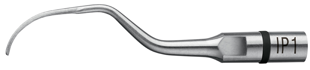 Насадка IP1 – насадка выполнена из титана, с самой широкой среди насадок IP рабочей частью, предназначенная для чистки абатмента имплантата и очистки витков резьбы. Насадка предназначена для профилактики и лечения периимплантита, удаления избытков цемента из под краёв коронок, фиксированных на имплантатах в эстетически значимых зонах, по форме функционального стержня повторяющая форму универсальной кюреты Лангера 5-6. Рабочей кончик лезвия заточен с двух граней. Благодаря наличию лезвий с 2х сторон кончика позволяет обрабатывать весь периметр имплантата и шейки абатмента во фронтальной группе. Сплав титана применяемый в насадках IP позволяет эффективно обрабатывать поверхность имплантатов из титана Grade 4, полируя его поверхность и удаляя биоплёнку. Универсальная ультразвуковая кюрета.