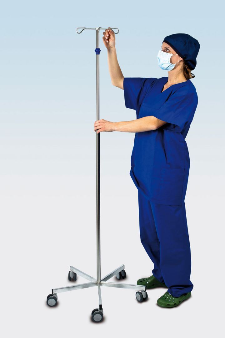 Передвижной штатив для инфузий с регулировкой высоты одной рукой и четырьмя крючками способствует максимально возможной свободе перемещения пациента. Он может быть расположен рядом с хирургическим столом или перемещаться вместе с пациентом при ходьбе. Отличная устойчивость обеспечивается надежной конструкцией из нержавеющей стали, тяжелой нижней крестовиной и пятью бесшумными роликовыми колесами.