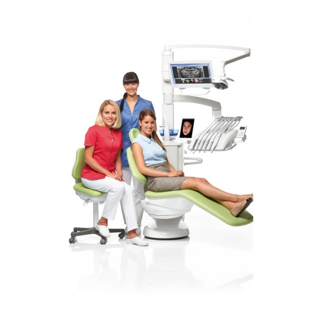 Настройте свою установку персонально под Вас посредством простого многоязычного сенсорного экрана. Подключите нужные инструменты на 6-позиционную консоль и используйте установку легко с первого дня. Расположите установку по желанию для лево/правосторонней работы ручной функцией поворота блока плевательницы и кресла. Удобный и модульный держатель шлангов аспирации и дополнительных инструментов Flexy™ обеспечит все Ваши потребности в лечении.