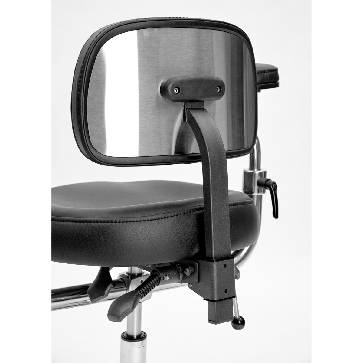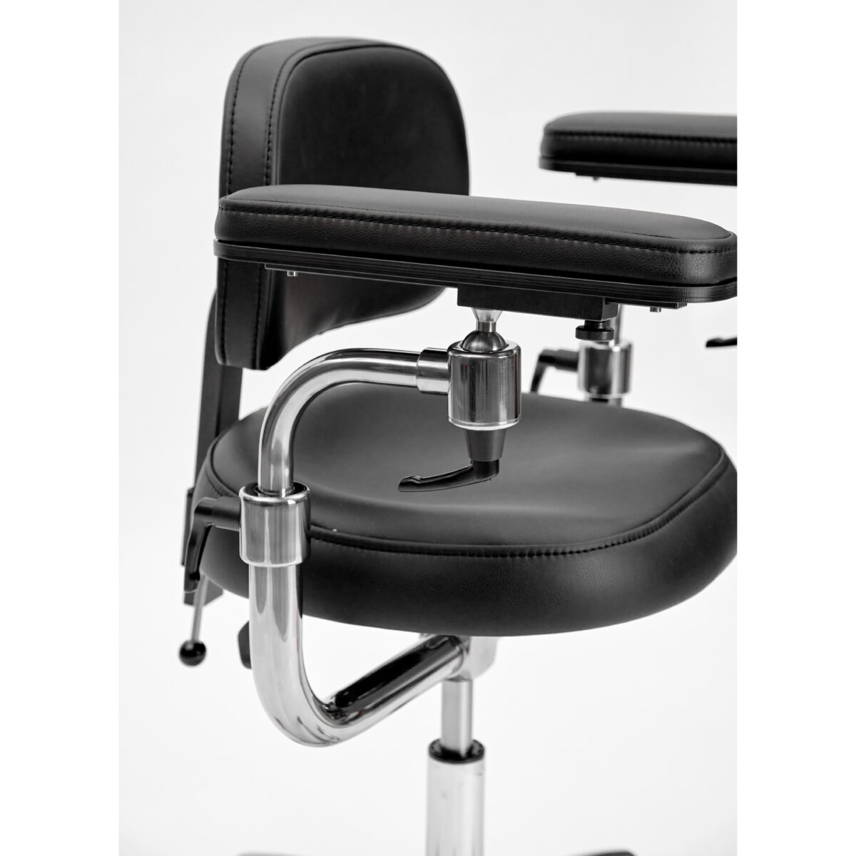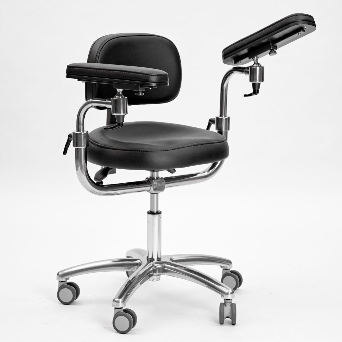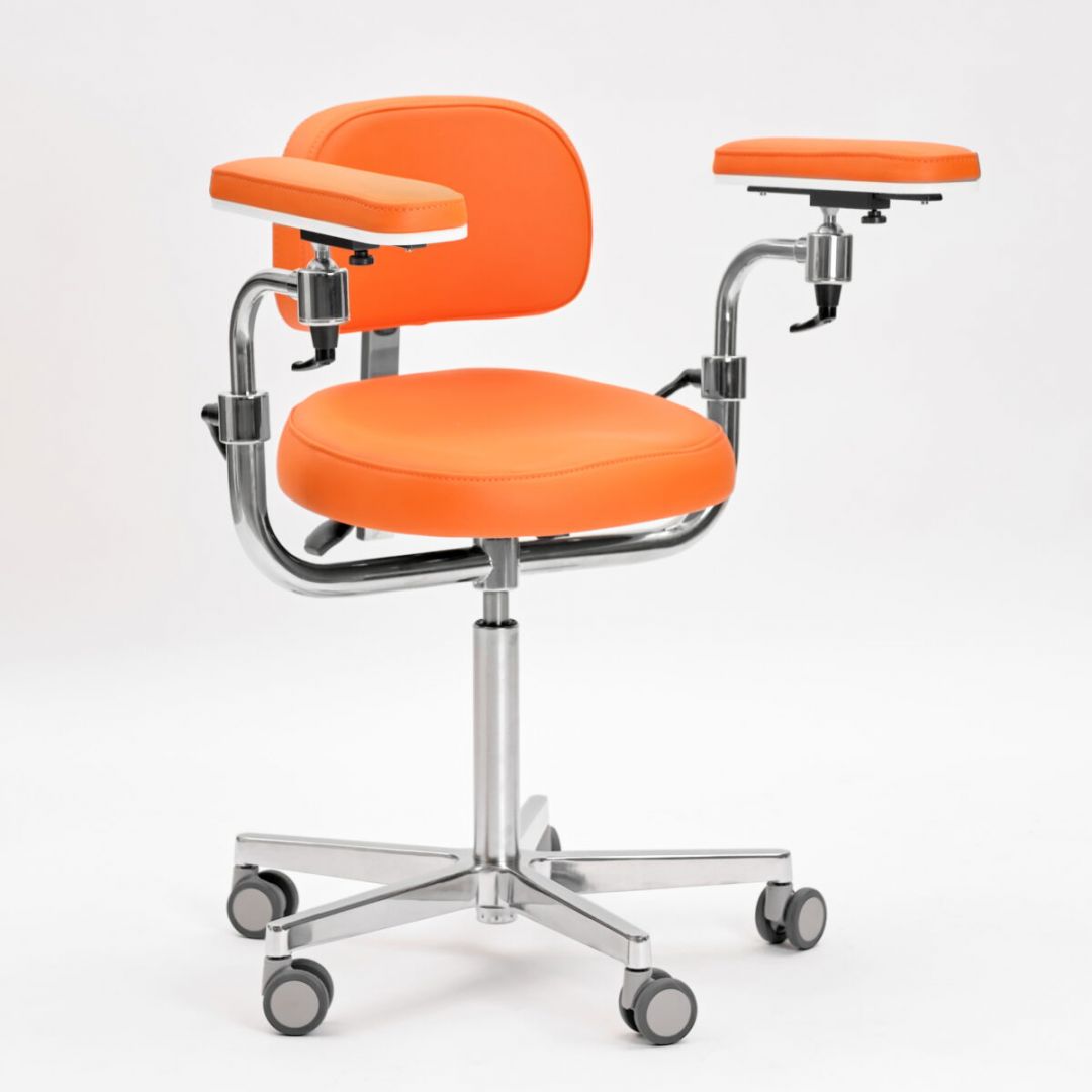 Эргономичный стул для работы с микроскопом. Подлокотники регулируются по высоте и углу наклона. Дополнительно имеют горизонтальную регулировку.
