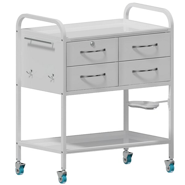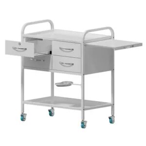 Каркас выполнен из профильной стальной трубы 20х20. По заявке комплектуется полками из стекла или нержавеющей стали. В стандартную сборку входят полки из металла, хромированные ручки и замок для одного из ящиков. Дополнительной опцией являются колеса из серой резины. Ящики установлены на телескопические шариковые направляющие. На левой боковой стенке крепится ручка рейлинг (хром); два двойных крючка (хром). С обратной стороны полка, выдвигающаяся из под столешницы , один ящик с замком. Почкообразный лоток из нержавеющей стали, на поворотном кронштейне.